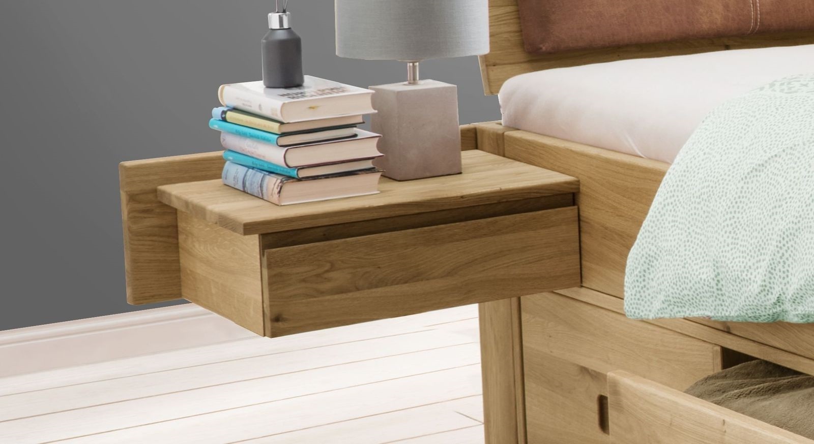 Подвесная тумба будет элегантным и практичным дополнением для кровати из массива
